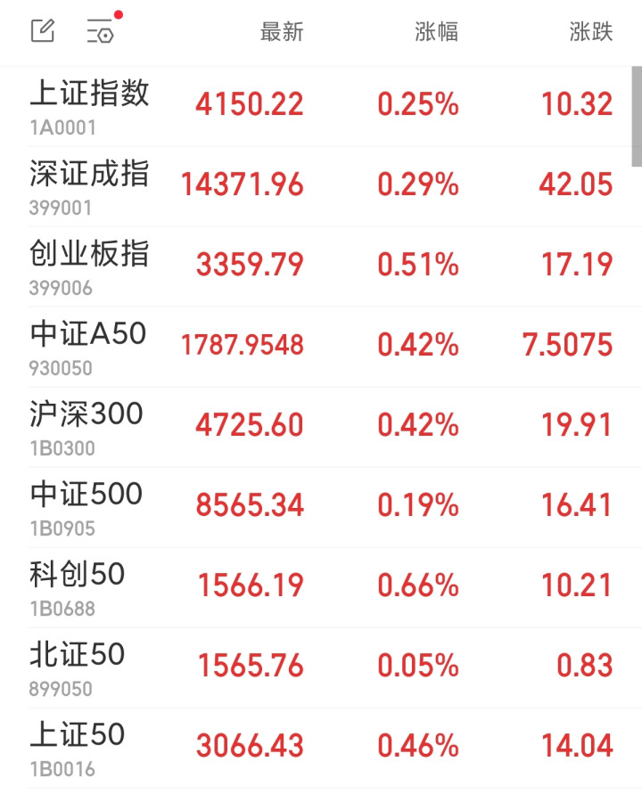 中新经纬1月28日电周三鼎配配资,A股三大指数集体高开。上证指数涨0.25%,报4150.22点;深证成指涨0.29%,报14371.96点;创业板指涨0.51%,报3359.79点。
